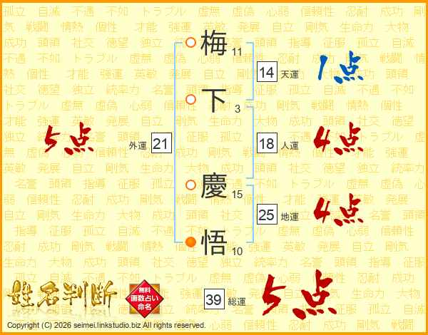 梅下慶悟さんの総運は39画の5点!