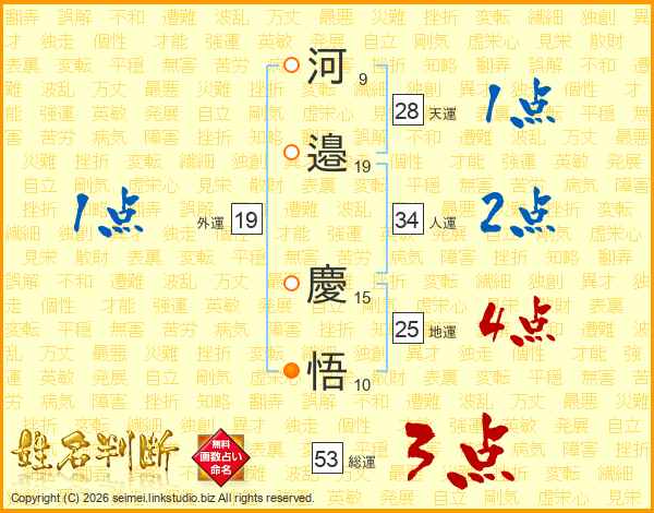 河(9画)邉(19画) 慶(15画)悟(10画)