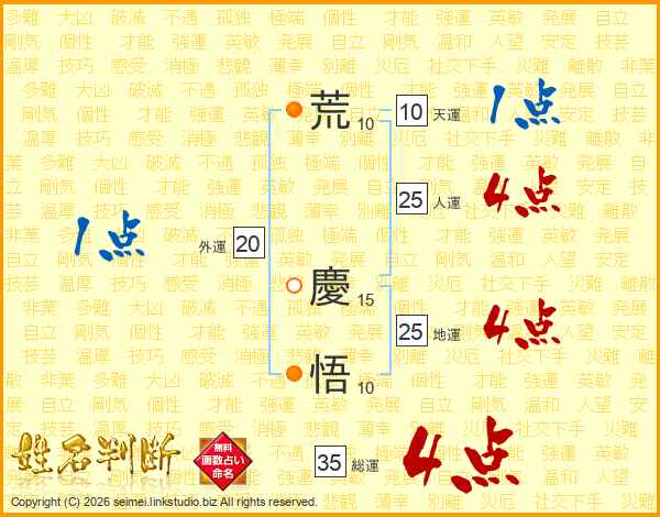 生活面を象徴する運勢です。外部から受ける影響力を表し、結婚運、家庭運や職場、環境への順応性を表します。総運から人運を引いた画数。姓や名が1文字の場合を除く。
