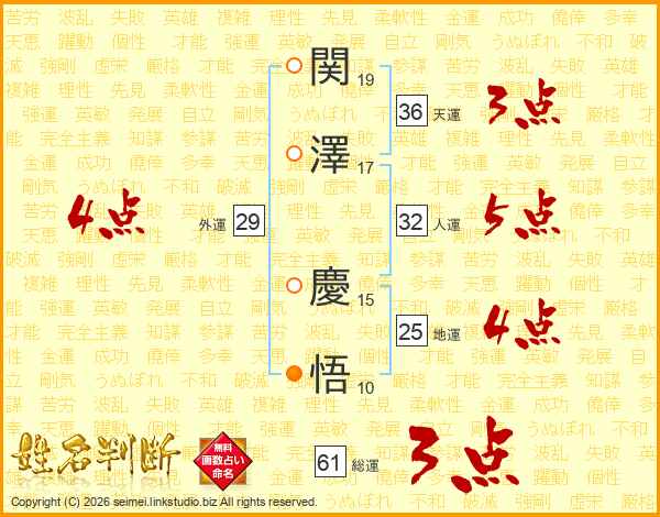 関(19画)澤(17画) 慶(15画)悟(10画)