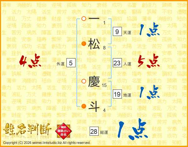 あなたの人生を表す1番重要な運勢です。生涯を通じて影響する総合運となり、主に50歳以降の晩年期に影響を及ぼします。苗字と名前の合計画数。