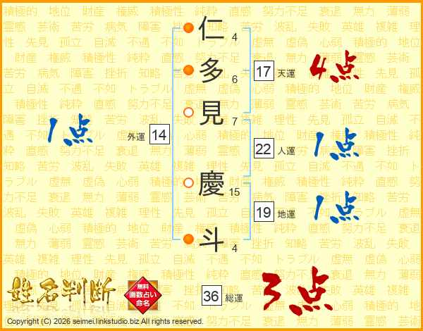 仁多見慶斗さんの外運は14画の1点!