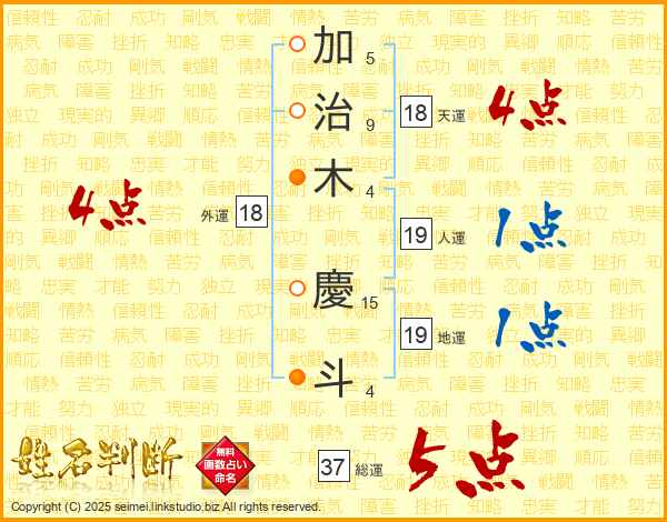 加(5画)治(9画)木(4画) 慶(15画)斗(4画)