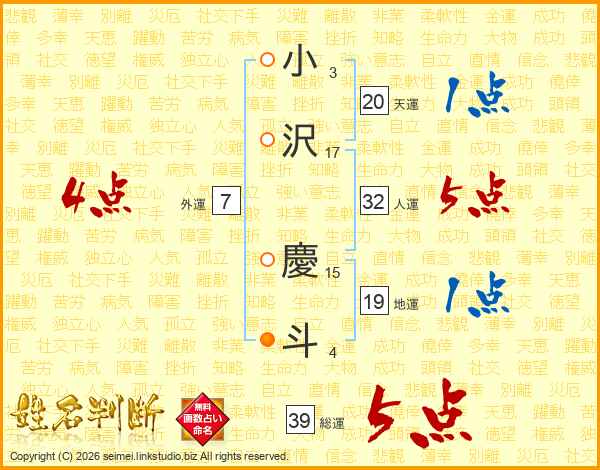 小(3画)沢(17画) 慶(15画)斗(4画)