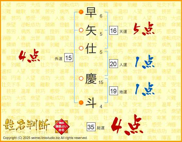 早(6画)矢(5画)仕(5画) 慶(15画)斗(4画)
