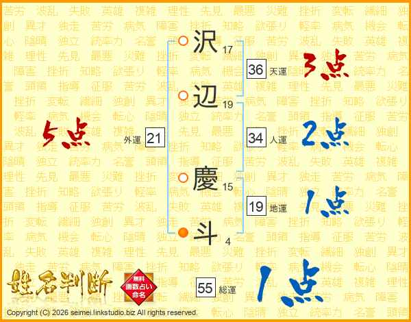 沢(17画)辺(19画) 慶(15画)斗(4画)