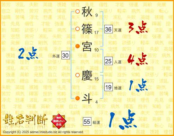 秋(9画)篠(17画)宮(10画) 慶(15画)斗(4画)