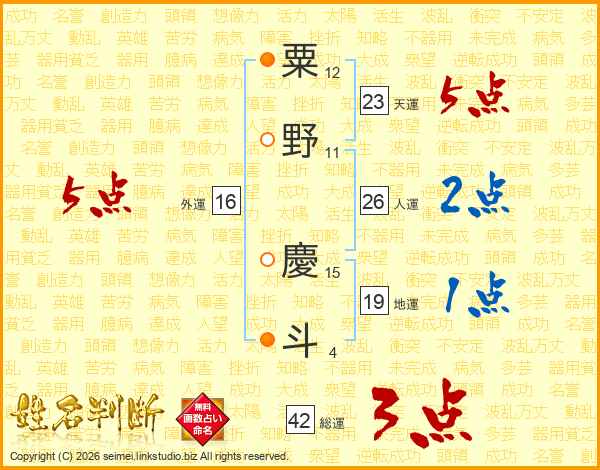 粟野慶斗さんの天運は23画の5点!