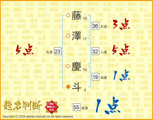 藤(19画)澤(17画) 慶(15画)斗(4画)