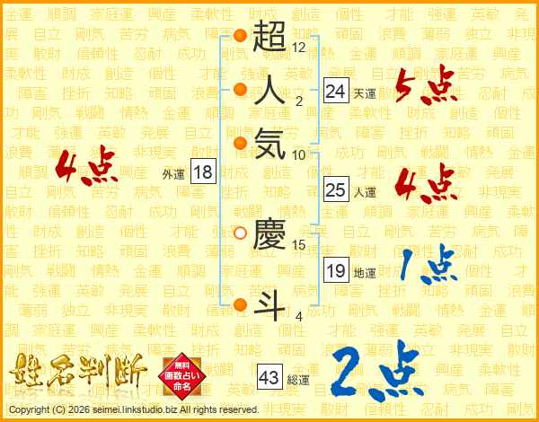超(12画)人(2画)気(10画) 慶(15画)斗(4画)