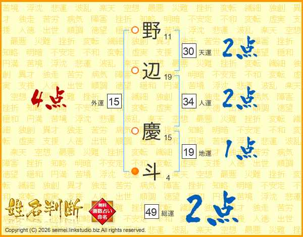野(11画)辺(19画) 慶(15画)斗(4画)