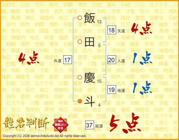 飯(13画)田(5画) 慶(15画)斗(4画)