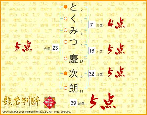 と(2画)く(1画)み(3画)つ(1画) 慶(15画)次(6画)朗(11画)