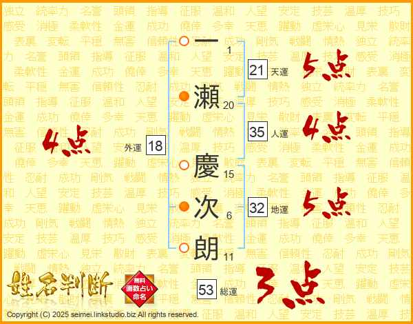 一(1画)瀬(20画) 慶(15画)次(6画)朗(11画)