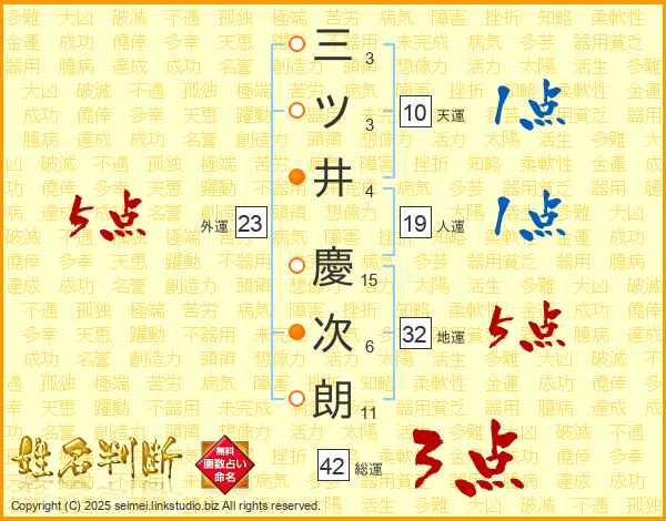 三(3画)ツ(3画)井(4画) 慶(15画)次(6画)朗(11画)