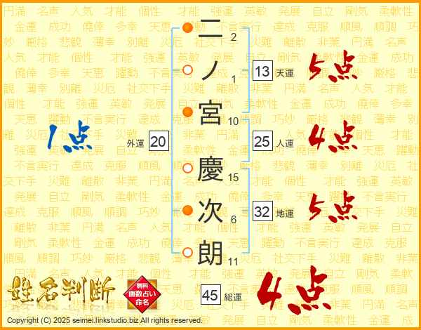 二(2画)ノ(1画)宮(10画) 慶(15画)次(6画)朗(11画)