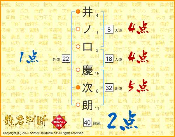 井(4画)ノ(1画)口(3画) 慶(15画)次(6画)朗(11画)
