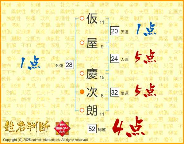 仮屋慶次朗さんの総運は52画の4点!