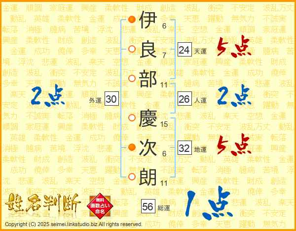 伊(6画)良(7画)部(11画) 慶(15画)次(6画)朗(11画)