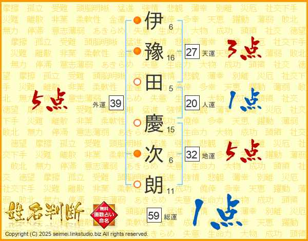 伊(6画)豫(16画)田(5画) 慶(15画)次(6画)朗(11画)