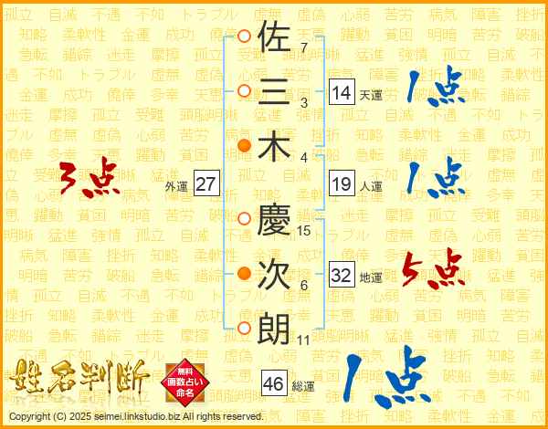 佐(7画)三(3画)木(4画) 慶(15画)次(6画)朗(11画)