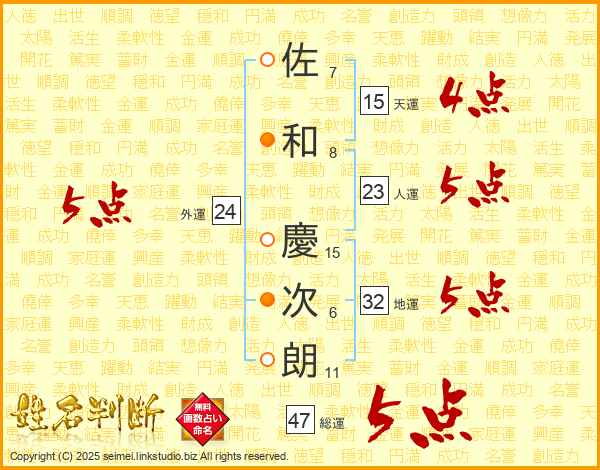 佐(7画)和(8画) 慶(15画)次(6画)朗(11画)