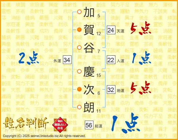 加(5画)賀(12画)谷(7画) 慶(15画)次(6画)朗(11画)