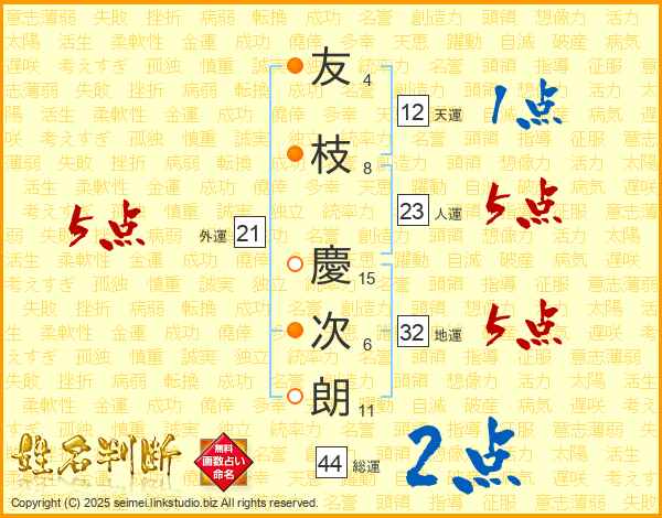 友枝慶次朗さんの総運は44画の2点!