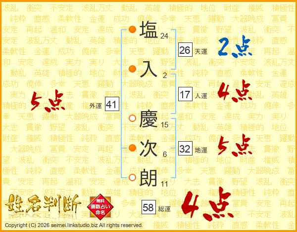 塩入慶次朗さんの総運は58画の4点!