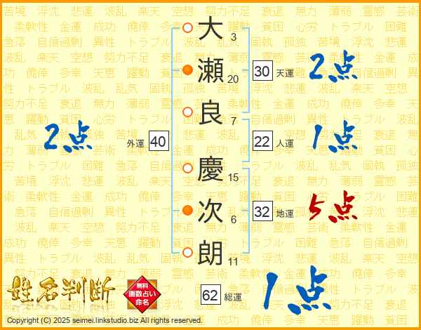 大(3画)瀬(20画)良(7画) 慶(15画)次(6画)朗(11画)