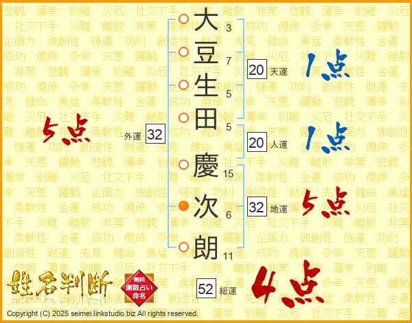 大(3画)豆(7画)生(5画)田(5画) 慶(15画)次(6画)朗(11画)