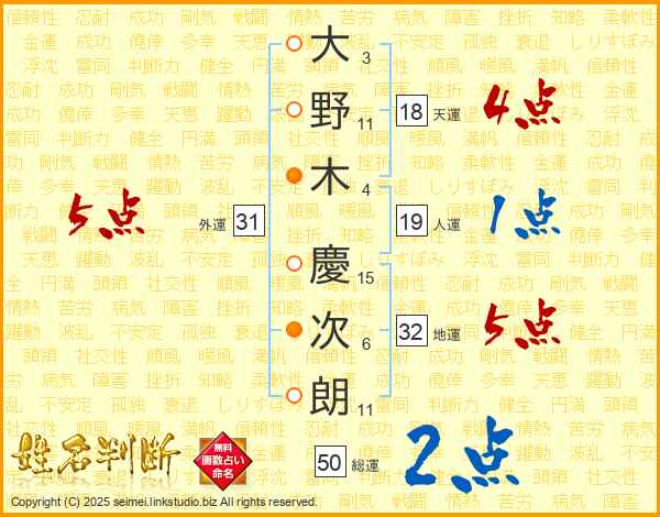 大(3画)野(11画)木(4画) 慶(15画)次(6画)朗(11画)