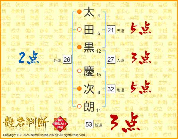 太(4画)田(5画)黒(12画) 慶(15画)次(6画)朗(11画)