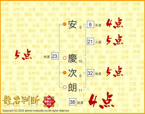 あなたの人生を表す1番重要な運勢です。生涯を通じて影響する総合運となり、主に50歳以降の晩年期に影響を及ぼします。苗字と名前の合計画数。