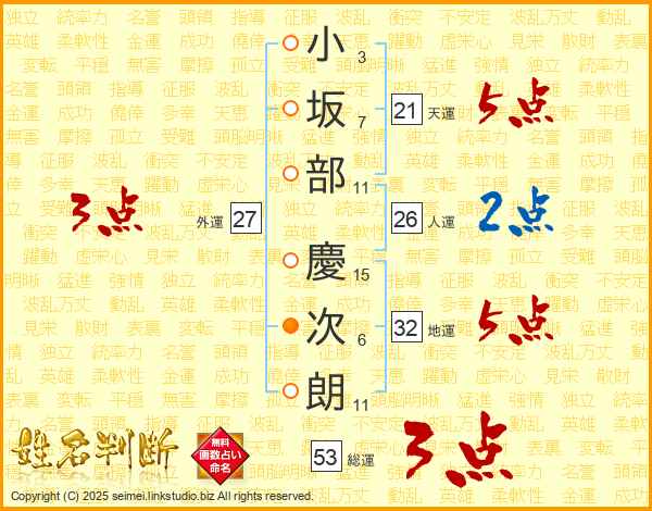 小(3画)坂(7画)部(11画) 慶(15画)次(6画)朗(11画)