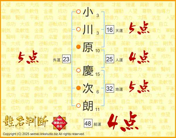 小(3画)川(3画)原(10画) 慶(15画)次(6画)朗(11画)