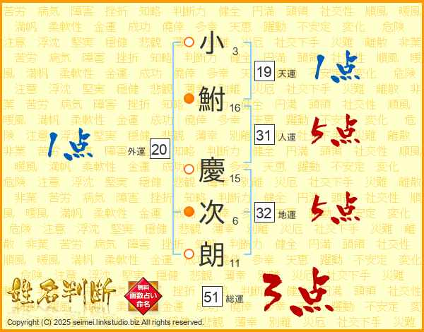 小(3画)鮒(16画) 慶(15画)次(6画)朗(11画)