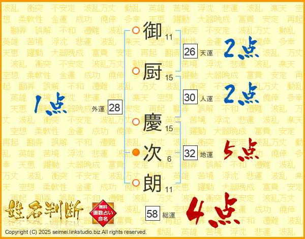 御(11画)厨(15画) 慶(15画)次(6画)朗(11画)