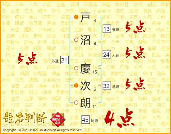 戸沼慶次朗さんの総運は45画の4点!
