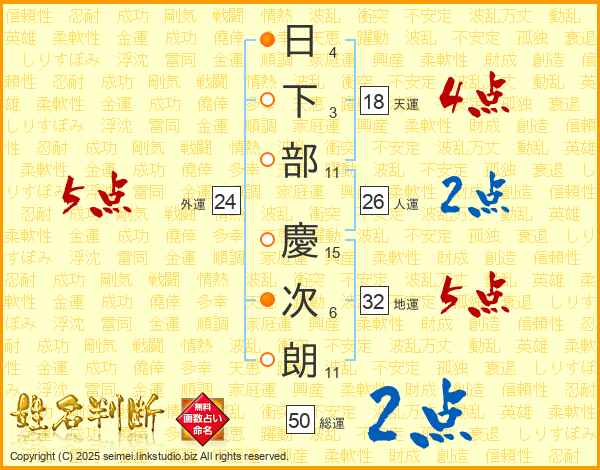 日(4画)下(3画)部(11画) 慶(15画)次(6画)朗(11画)