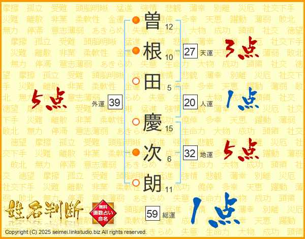 曽(12画)根(10画)田(5画) 慶(15画)次(6画)朗(11画)