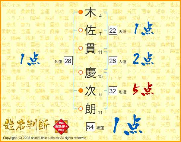 木(4画)佐(7画)貫(11画) 慶(15画)次(6画)朗(11画)