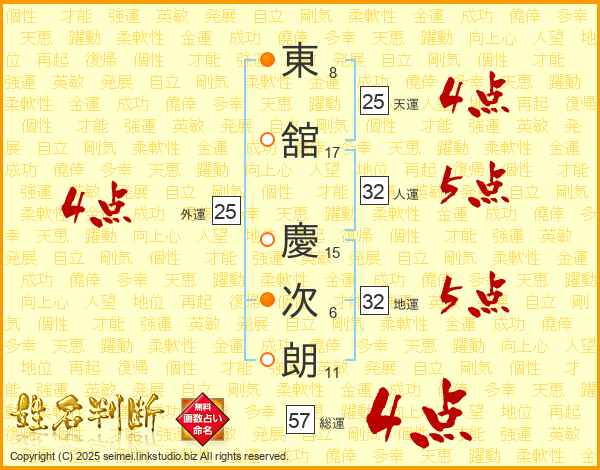 東(8画)舘(17画) 慶(15画)次(6画)朗(11画)