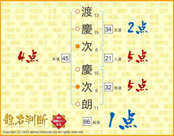 渡(13画)慶(15画)次(6画) 慶(15画)次(6画)朗(11画)