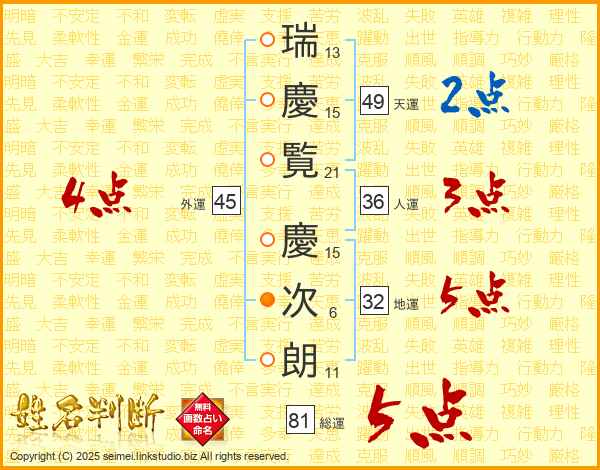 瑞(13画)慶(15画)覧(21画) 慶(15画)次(6画)朗(11画)