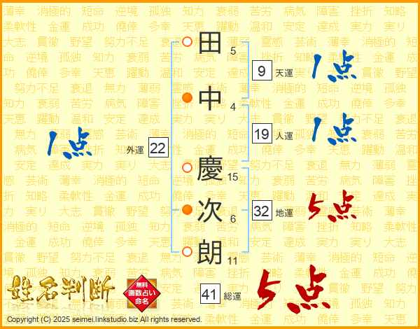 田(5画)中(4画) 慶(15画)次(6画)朗(11画)