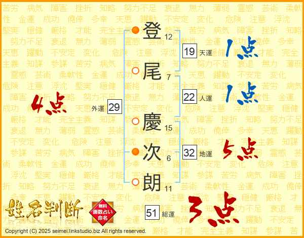 登尾慶次朗さんの総運は51画の3点!