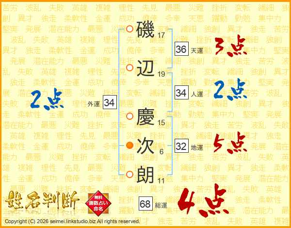 磯(17画)辺(19画) 慶(15画)次(6画)朗(11画)