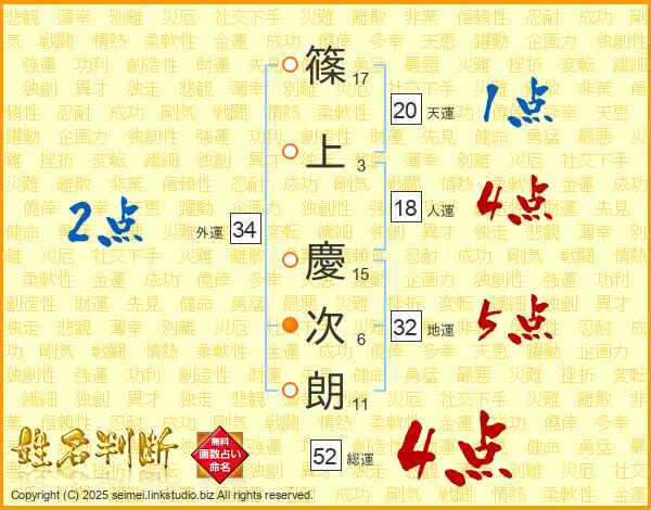 篠(17画)上(3画) 慶(15画)次(6画)朗(11画)