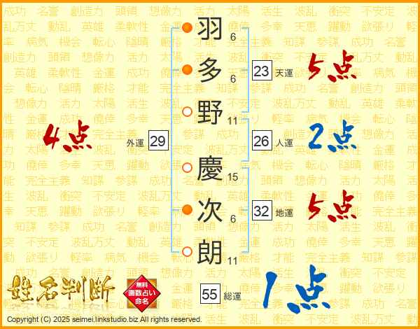 羽(6画)多(6画)野(11画) 慶(15画)次(6画)朗(11画)